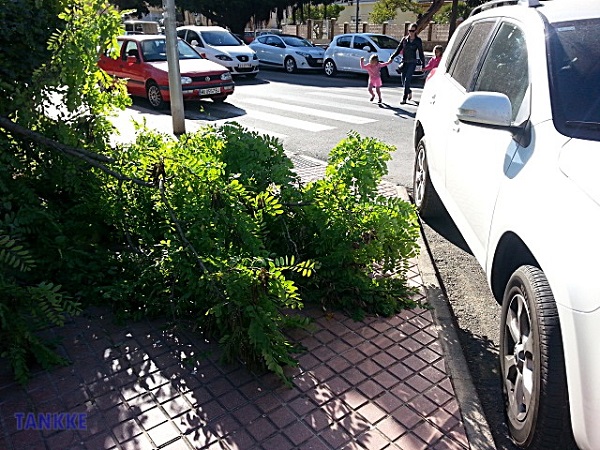 Las fuertes rachas de viento que azotaron ayer a la ciudad provocaron que algunas ramas de árbol, como la de la imagen, cayeran a la cera. Por suerte, no hubo que lamentar daños personales.