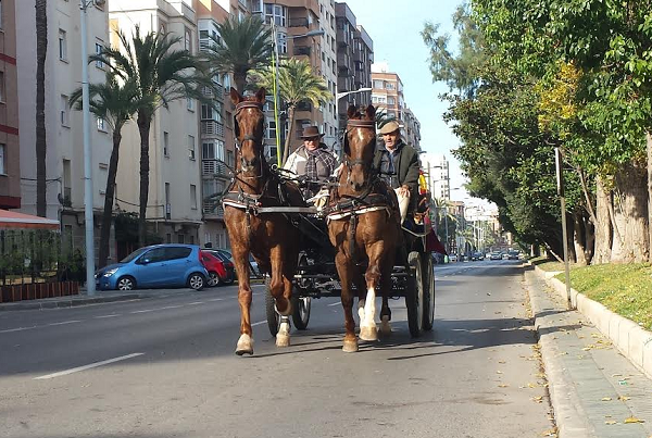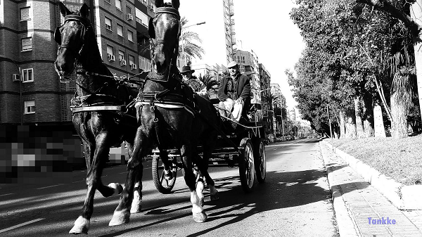 Un dos caballos paseando por la ciudad en un día soleado y solitario.