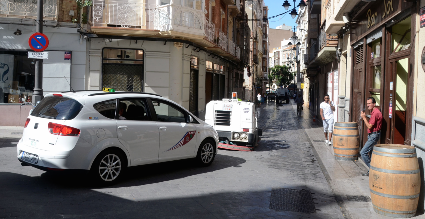 Una maquina de limpieza de calles ha vertido por el casco histórico de Cartagena un contenido de grasa del vehículo, lo que ocasionó que dos personas resbalaran cayendo al suelo. Después se produjo el lógico atasco mientras se limpiaban las vías.