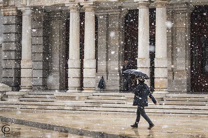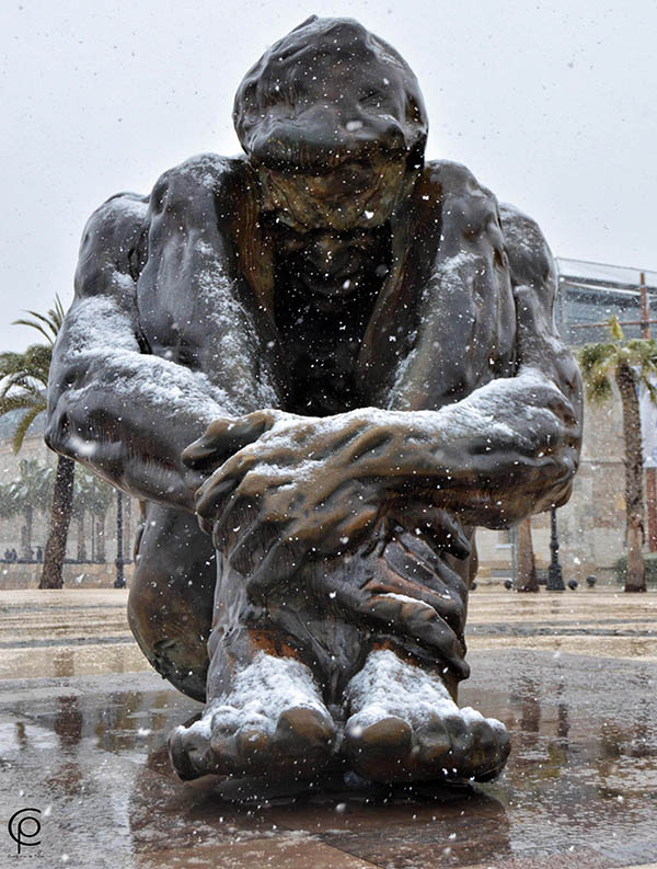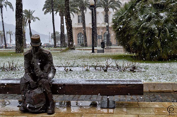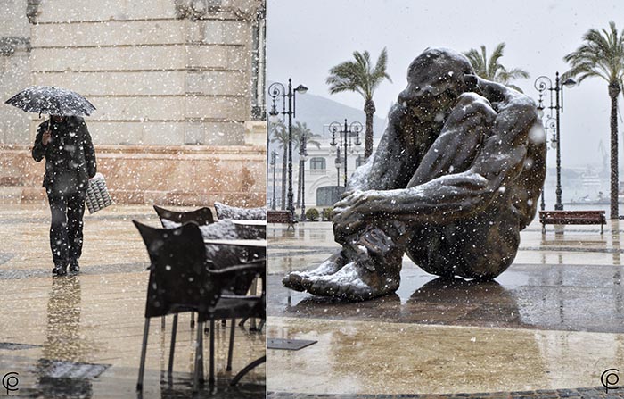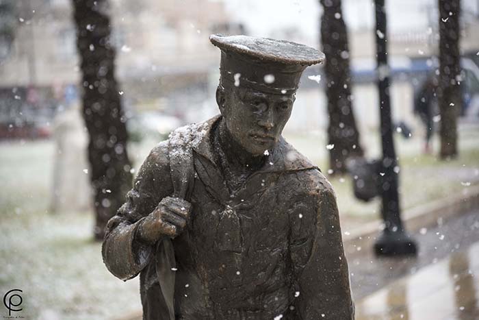 Los 'militares' de las plazas de Héroes de Cavite y del Ayuntamiento también fueron testigos de la nevada que vivió Cartagena el pasado día 18, al igual que 'El Zulo', el monumento dedicado a las víctimas del terrorismo, y diversos viandantes.
