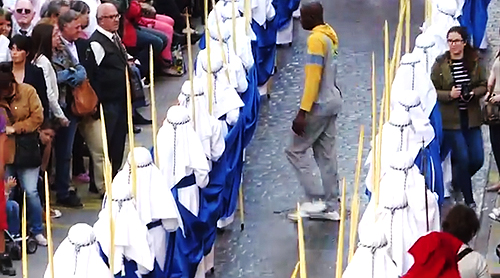 Todavía siguen produciéndose ejemplos de personas que cruzan las procesiones por la zona donde están los penitentes alineados. Valga esta foto con dos ejemplos.