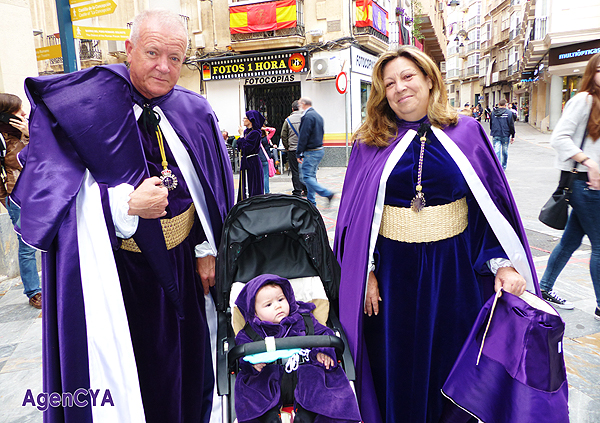 Aria, con sólo cinco meses de edad, se ha estrenado esta Semana Santa como procesionista activa. En la imagen posa con sus abuelos antes de la procesión del Sábado Santo.