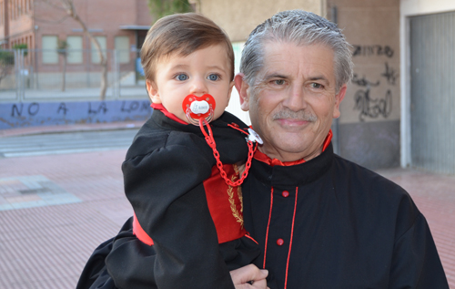 Alonso Gómez López, concejal del ayuntamiento de Cartagena, acumula dieciocho años metiendo el hombro bajo el trono del Cristo de la Flagelación en el Miércoles Santo californio. En la imagen aparece con su nieto, Alonso Muñoz Gómez, quien ya luce el vestuario de los portapasos del trono.