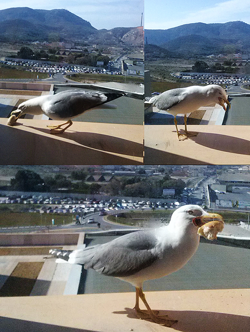 Simpática secuencia de una gaviota recogiendo su particular menú junto a una ventaja del hospital de Santa Lucía.