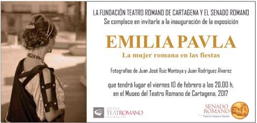 El Museo del Teatro Romano de Cartagena acogerá el próximo 10 de febrero la inauguración de la exposición fotográfica 'Emilia Paula: La mujer romana en las Fiestas' de Carthagineses y Romanos, organizada por la Fundación del Teatro Romano y el Senando Romano, y en la que se muestran imágenes captadas por Juan José Ruiz Montoya y Juan Rodríguez Álvarez.