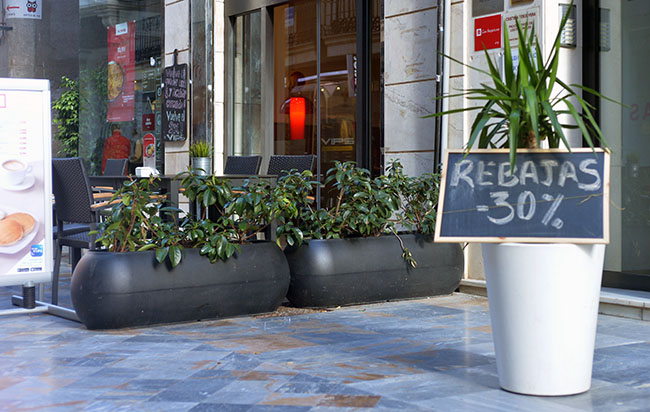Hasta los maceteros de la calle están de rebajas. En Cartagena de Imagen nos hemos encontrado con que éste ofrece un 30% de descuento. Quien ande despistado y desconozca que las rebajas son de una tienda situada al lado podría pensar que se puede llevar el macetero a su casa.