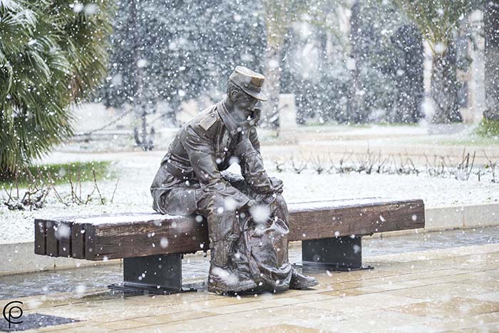 Los 'militares' de las plazas de Héroes de Cavite y del Ayuntamiento también fueron testigos de la nevada que vivió Cartagena el pasado día 18, al igual que 'El Zulo', el monumento dedicado a las víctimas del terrorismo, y diversos viandantes.