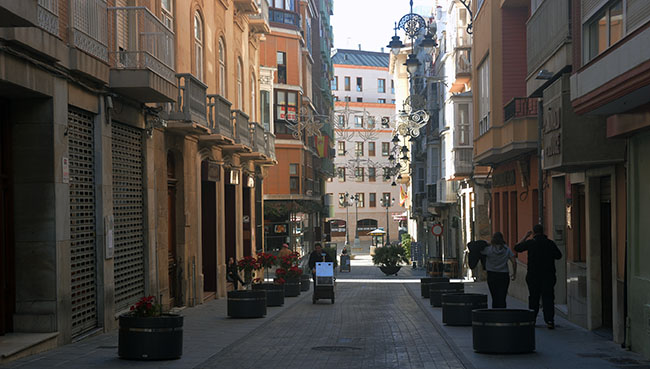 Curiosa imagen de la calle Cañón del casco urbano en el que en un lado de la vía los maceteros lucen flores y en el otro, no.