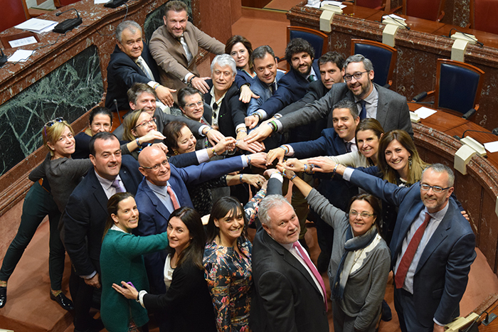 Los diputados del grupo parlamentario Popular y el personal del grupo, han querido tener un gesto de apoyo a la Asociación de Familiares de Niños con Cáncer de la Región de Murcia (AFACMUR) y se han hecho una foto, tras finalizar la sesión plenaria de esta mañana, luciendo en sus muñecas la pulsera que la asociación ha puesto en circulación como muestra de unión y respaldo a su causa.