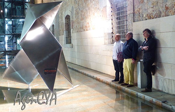 El pintor Pedro Pérez Casanova y los troveros Joaquín Sánchez 'El Palmesano' y Pedro Jesús junto a la gigantesca pajarita que luce en el edificio de la UPCT en el antiguo CIM.