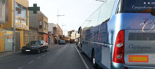 Imagen captada a las ocho y media de esta mañana en la arteria principal del barrio de San Antón, que recuerda aquellos atascos que se producían cuando la fábrica de Licor 43 estaba en dicha zona.