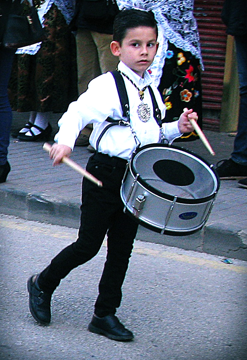 Un niño acompañando perfectamente a la banda de tambores y cornetas.
