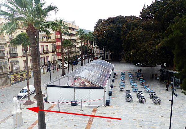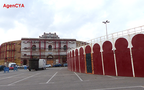 La que fuese gran plaza de toros de Cartagena frente a la plaza portátil que se ha instalado con motivo del Mercado Medieval que se celebra en el fin de semana.